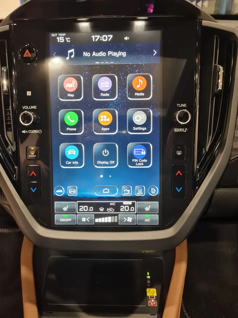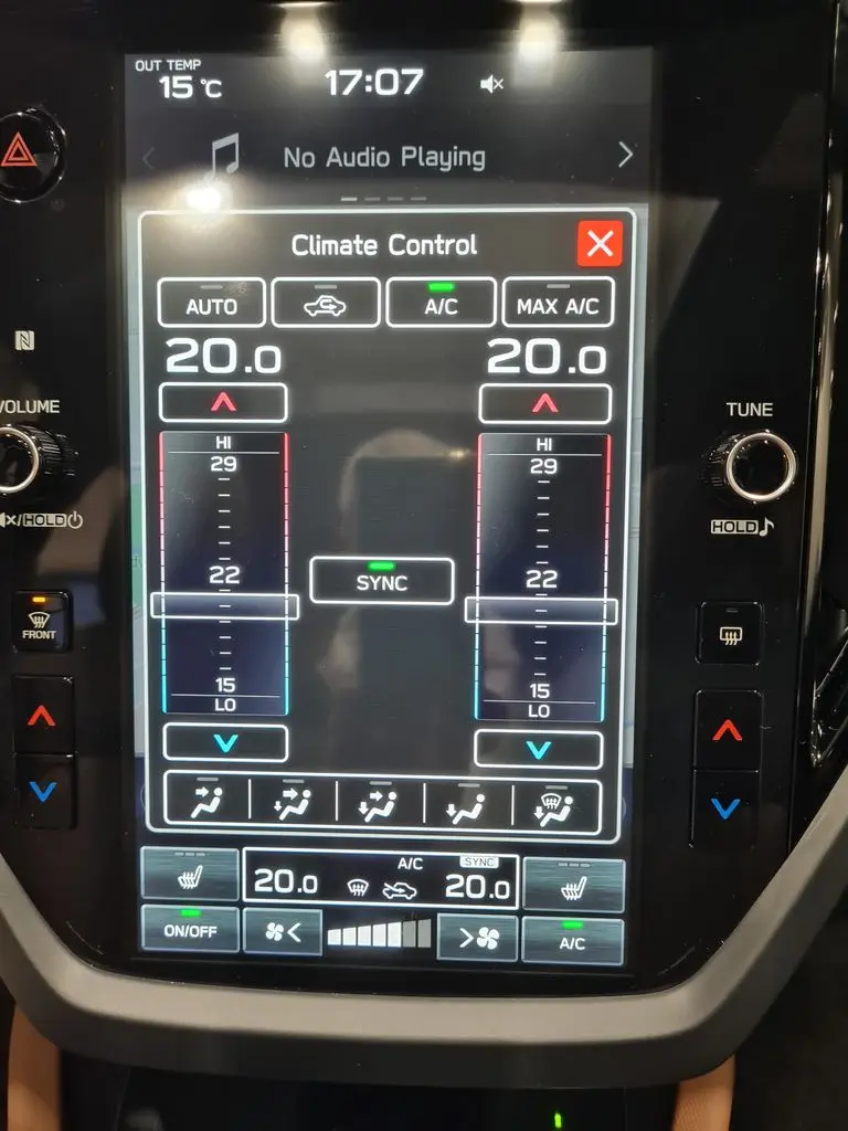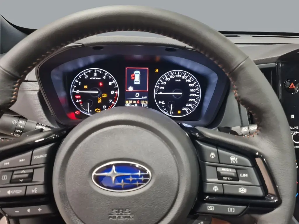 VNĚJŠÍ VÝBAVA LED světlomety s aut. vyrovnáváním výšky s automatickým vypínáním a zapínáním osvětlení Tlakové vysouvací ostřikovače světlometů LED přední a zadní mlhová světla LED zadní sdružená světla Elektricky ovládaná a sklopitelná vnější zpětná zrcátka Automatické přední stěrače s dešťovým senzorem Zatmavená boční zadní okna a zadní okno Privacy 19" kola z lehké slitiny (leštěná) Sada 18" černých kol Elektricky ovládané posuvné a výklopné střešní okno Střešní ližiny (nízké) SEDADLA / ČALOUNĚNÍ Kožený volant s hnědým prošíváním Kožený volič převodovky Vyhřívání volantu Kožené čalounění sedadel Vyhřívání předních sedadel Vyhřívání předních sedadel V 10 směrech elektricky nastavitelné sedadlo řidiče s bederní opěrkou a v 8 spolujezdce Zpětné zrcátko propojené s paměťovou funkcí sedadla řidiče s funkcí automatického sklápění při couvání Polohovatelná opěradla zadních sedadel ve třech polohách Opěradla zadních sedadel dělená v poměru 60/40 KOMFORT / POHODLÍ Keyless Access – bezklíčkové senzorové ovládání centrálního zamykání vozu a startování Stropní úložný box LED osvětlení zavazadlového prostoru LED světlo na víku zavazadlového prostoru Středová loketní opěrka na zadních sedadlech, 2 integrované držáky nápojů Dvě 12voltové zásuvky (ve středové konzole a v zavazadlovém prostoru) Elektrické ovládání víka zavazadlového prostoru pohybem nohy pod nárazníkem Háčky na tašky v zavazadlovém prostoru (4×) Háčky na síťku v zavazadlovém prostoru (4×) Horní háčky v zavazadlovém prostoru (2×) Krycí roleta zavazadlového prostoru Úložná schránka pod podlahou zavazadlového prostoru Dojezdová opravná sada pneumatik TOPENÍ / KLIMATIZACE Dvouzónová automatická klimatizace Hlasové ovládání klimatizace Rozmrazovač stěračů předního okna Vyhřívaná vnější zpětná zrcátka Vyhřívání zadního okna s časovačem Topení a klimatizace pro zadní sedadla AUDIO A NAVIGACE 11,6palcový HD displej, navigace, prémiový audiosystém s 10 reproduktory Harman/Kardon, subwooferem a 8kanálovým zesilovačem Bezdrátové Apple CarPlay a Android Auto Přístup do vozu pomocí kódu PIN Hlasové ovládání Přední USB porty (typ A a C) a konektor AUX Zadní nabíjecí USB porty (typ A a C) za schránkou na středové konzole Bezdrátová nabíječka (středová přihrádka palubní desky) PŘÍSTROJE / OVLÁDÁNÍ V obou osách nastavitelný volant Řadicí páčky pod volantem JÍZDNÍ SYSTÉMY SI-DRIVE – systém režimů motoru a převodovky (SUBARU Intelligent Drive) X-MODE se dvěma režimy Hill Descent Control – systém pro sjíždění svahu Auto Vehicle Hold – systém pro stání bez stisknutého pedálu brzdy Vehicle Dynamics Control – stabilizační systém Towing Vehicle Dynamics Control Systém – stabilizace přívěsu Electronic Parking Brake – elektronická parkovací brzda EYESIGHT Předkolizní brzdový systém Přední předkolizní brzdový systém Autonomní nouzové řízení Adaptivní tempomat Udržování uprostřed jízdního pruhu a adaptivní vedení vozu podle vozidla vpředu Funkce zabraňující vyjetí z jízdního pruhu Asistent nouzového udržení v jízdním pruhu Systém ochrany proti neúmyslnému rozjetí Upozornění na rozjezd vozidla vpředu Inteligentní adaptivní tempomat Rozpoznávání dopravních značek Inteligentní omezovač rychlosti Manuální omezovač rychlosti EyeSight Assist Monitor High Beam Assist (HBA) – asistent dálkových světel BEZPEČNOST Přední airbagy Přední boční airbagy (řidič a spolujezdec) Hlavové airbagy (přední i zadní sedadla na obou stranách) Kolenní airbag (řidič) Airbag v sedadle (spolujezdec) Středový airbag (řidič) Natáčecí světlomety SRH LED odbočovací světla Subaru Rear Vehicle Detection (SRVD) Automatické brzdění při přiblížení se k překážce při couvání RAB (Reverse Automatic Braking) Samozatmavovací vnitřní zpětné zrcátko Kamerový systém Multi View Monitor 360 Zadní couvací kamera Systém monitorování řidiče DMS (Driver Monitoring System) e-Call (systém tísňového volání) Systém nouzového zastavení Systém kontroly tlaku v pneumatikách (TPMS) Ukazatel nezapnutých bezpečnostních pásů Výškově nastavitelné horní úchyty bezpečnostních pásů (řidič a spolujezdec) Uchycení dětské sedačky ISO-FIX (s horními úchyty) Dětská pojistka zadních dveří (po obou stranách) Imobilizér motoru Nástroj na rozbíjení skla při nouzové evakuaci ZÁRUKA Prodloužená záruka na 5 let / 200 000 km a asistenční služby na 5 let v hodnotě 23 890 Kč ZDARMA
