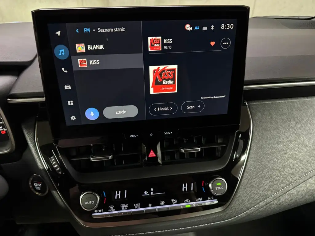 Multimediální centrum vozu s barevným displejem pro poslech hudby, rádia, ovládání funkcí a zobrazení informací o jízdě.